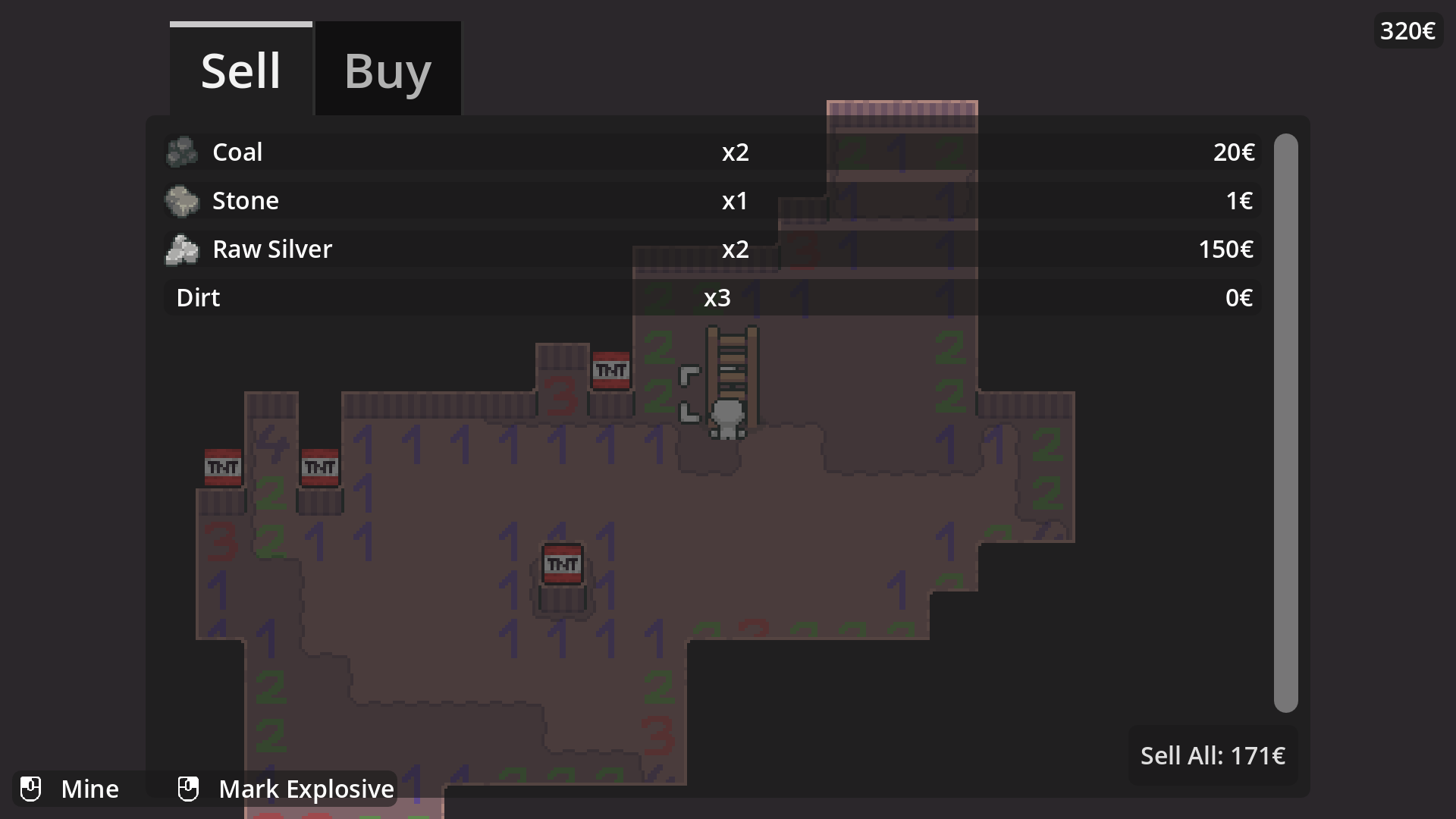I really like the take on this, even if I sometimes come across TNT that I swear shouldn't be there according to surrounding numbers. The upgrades though don't really do much though. Slightly increasing mining speed, and carrying capacity. Its little improvements but doesn't really help out much like most upgrades in incremental games. What about something that give you an ability to place a bomb to clear a space, or a device you can use from time to time that will confirm if TNT is in a spot that you're unsure about? Abilities you can buy that have timers so you can't just spam them. Something to give a little bit of help those of us who aren't masters at minesweeper. For example, an ability that has a 1 min timer that can confirm if a spot you're looking at has TNT or not. Upgrades to increase movement speed. There are probably other little upgrades that could be added that wouldn't take away from the challenge to much if done right.